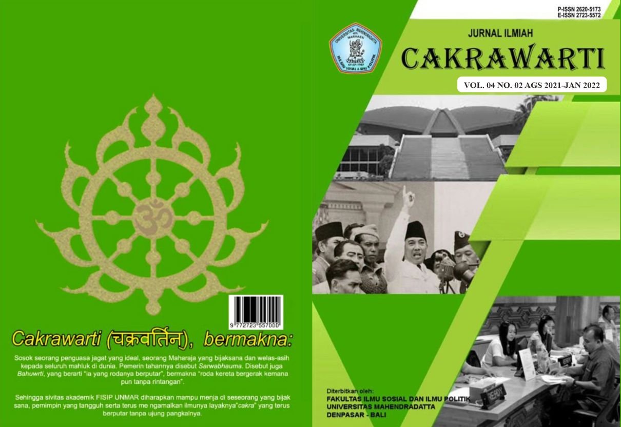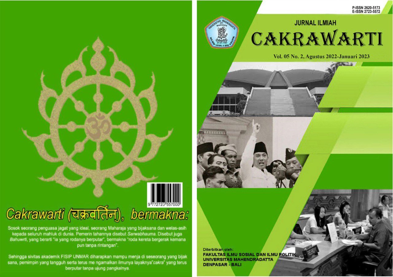 Jurnal Ilmiah Cakrawarti Vol. 8 No. 2 (August 2025) presents a selection of peer-reviewed articles focusing on current issues in social sciences, political science, and public administration. Topics include digital governance, gender politics, public policy, and civil society dynamics. Published by Universitas Mahendradatta twice of year, the journal is indexed in Google Scholar and GARUDA, with P-ISSN: 2620-5173 and E-ISSN: 2723-5572. This edition reflects our commitment to academic excellence and interdisciplinary insight.